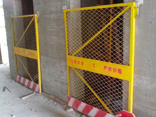 電梯井口防護(hù)門全部由鋼結(jié)構(gòu)組成。鋼材采用國(guó)家標(biāo)準(zhǔn)材料,制作嚴(yán)格按圖施工,尺寸正確,焊接點(diǎn)牢固,達(dá)到安全防護(hù)之目的,電梯安全門采用檸檬黃色,門下部檔架板采用黃、黑間隔。電梯井口防護(hù)門是建筑施工現(xiàn)場(chǎng)預(yù)防人身傷害必備的防護(hù)設(shè)施,它適用于各類建筑施工工地。